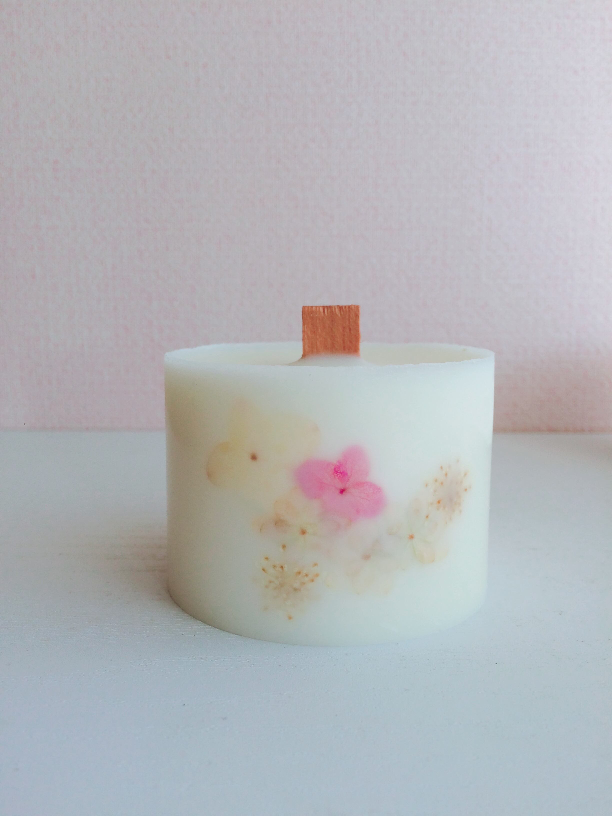 そんな植物由来の体に優しいソイワックスに、押し花をあしらいました。