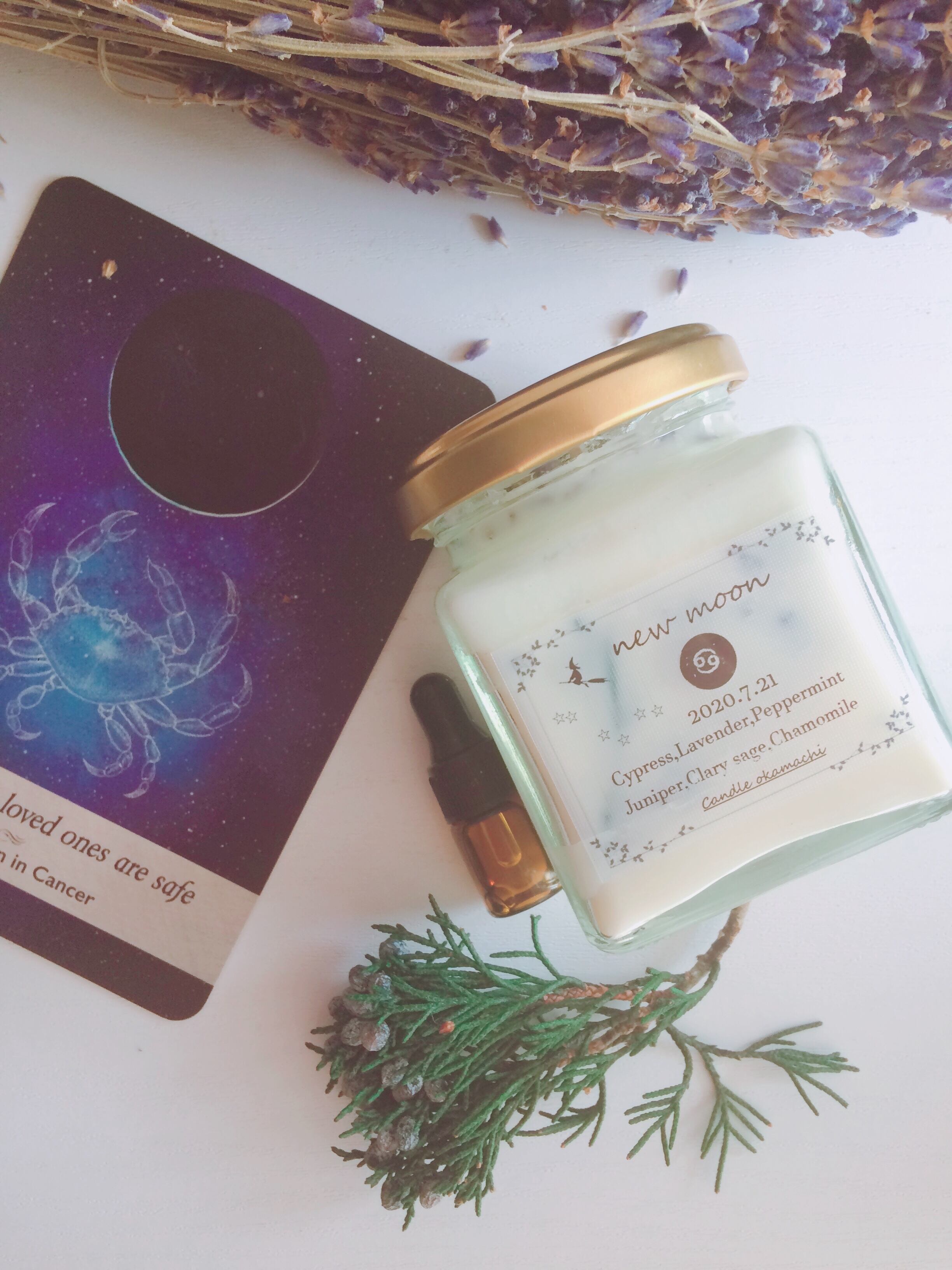 キャンドル工房okamachiの新月アロマキャンドルは 新月にオススメの精油に加えて 星座の精油を追加でブレンドしてあります