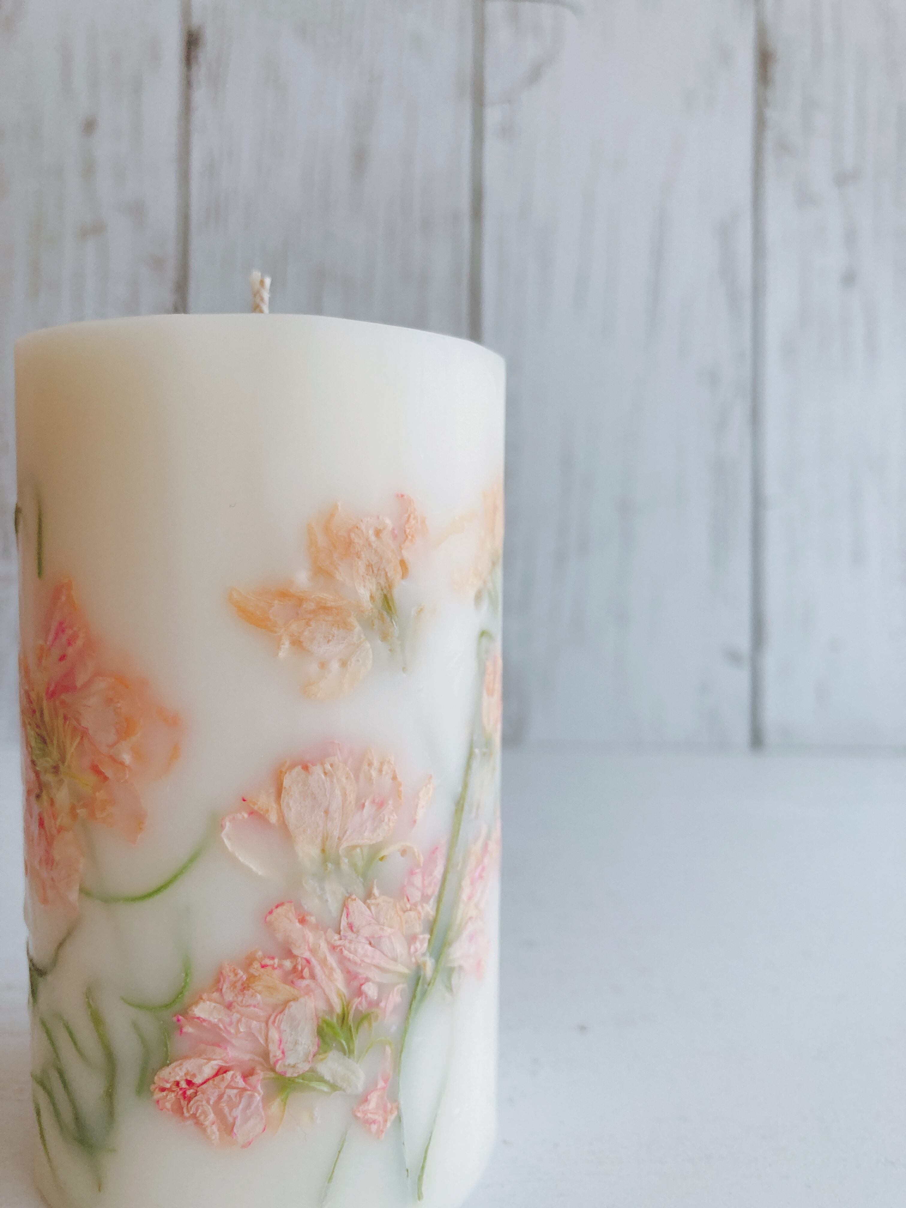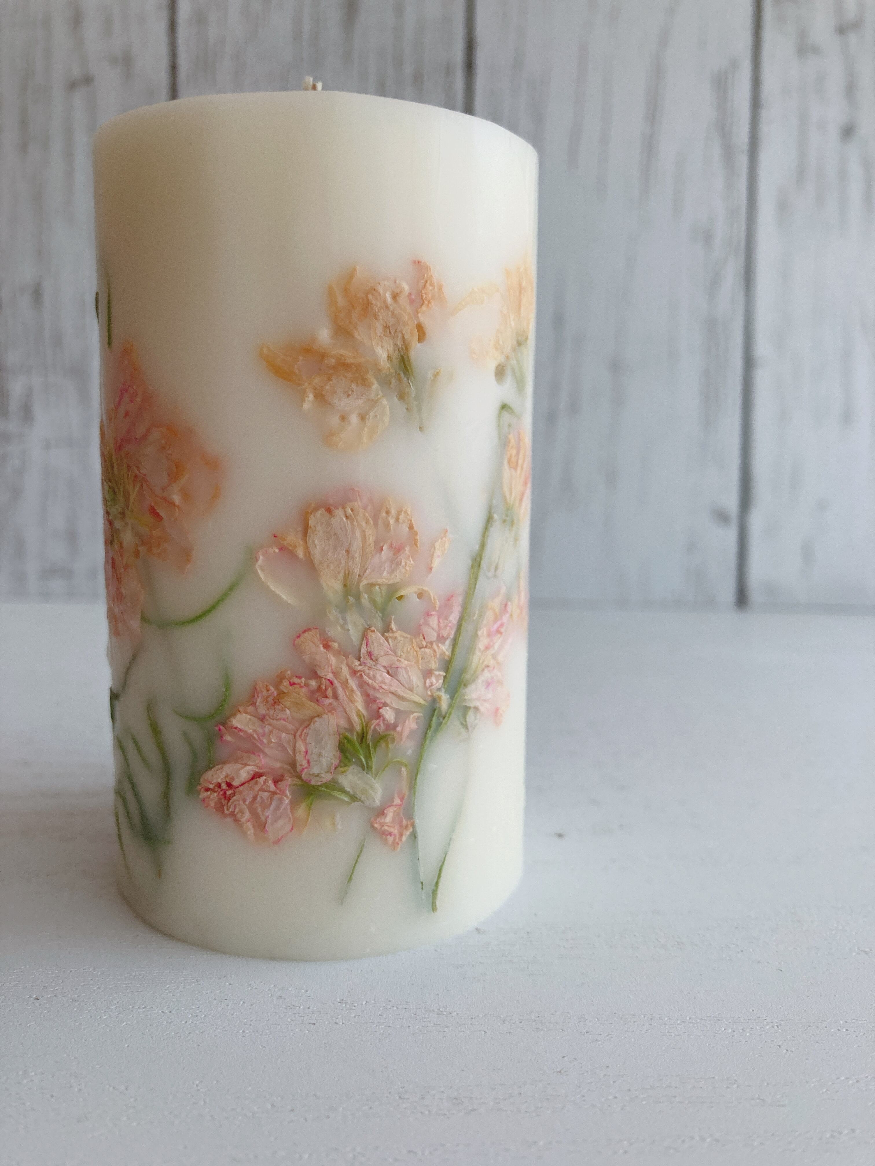 ストックのドライフラワーを詰め込んだキャンドル。優しい色合いのピンクです。