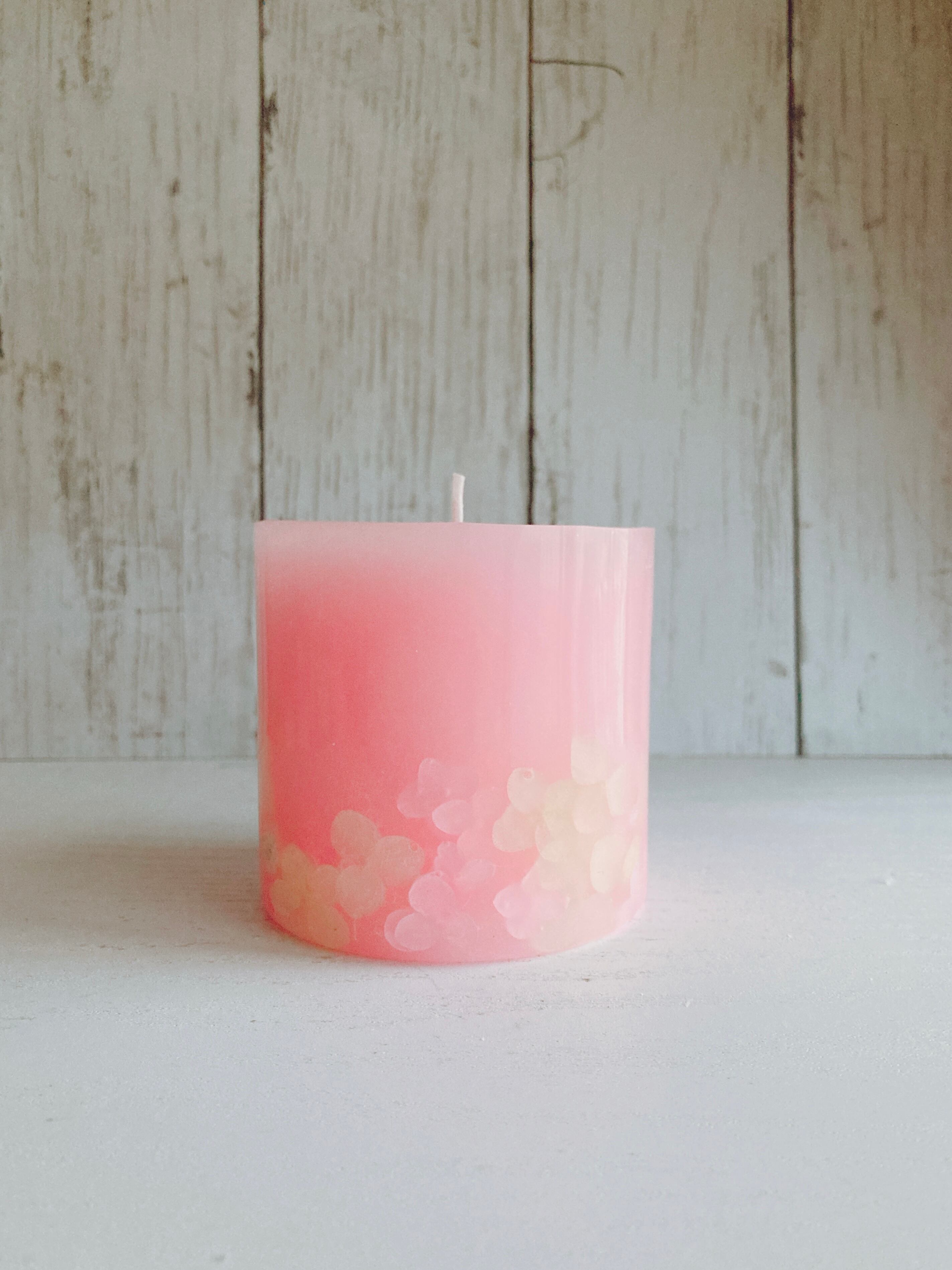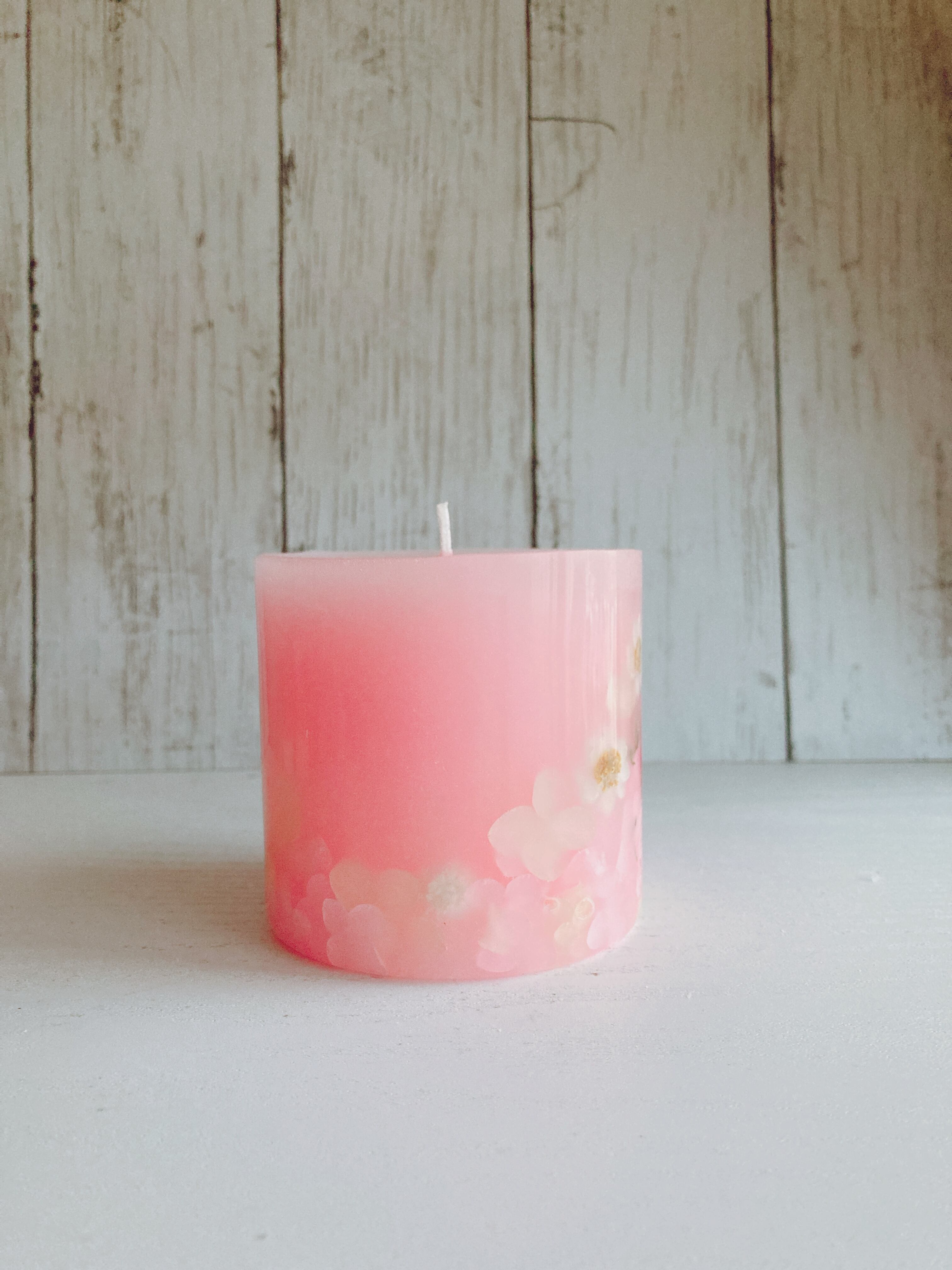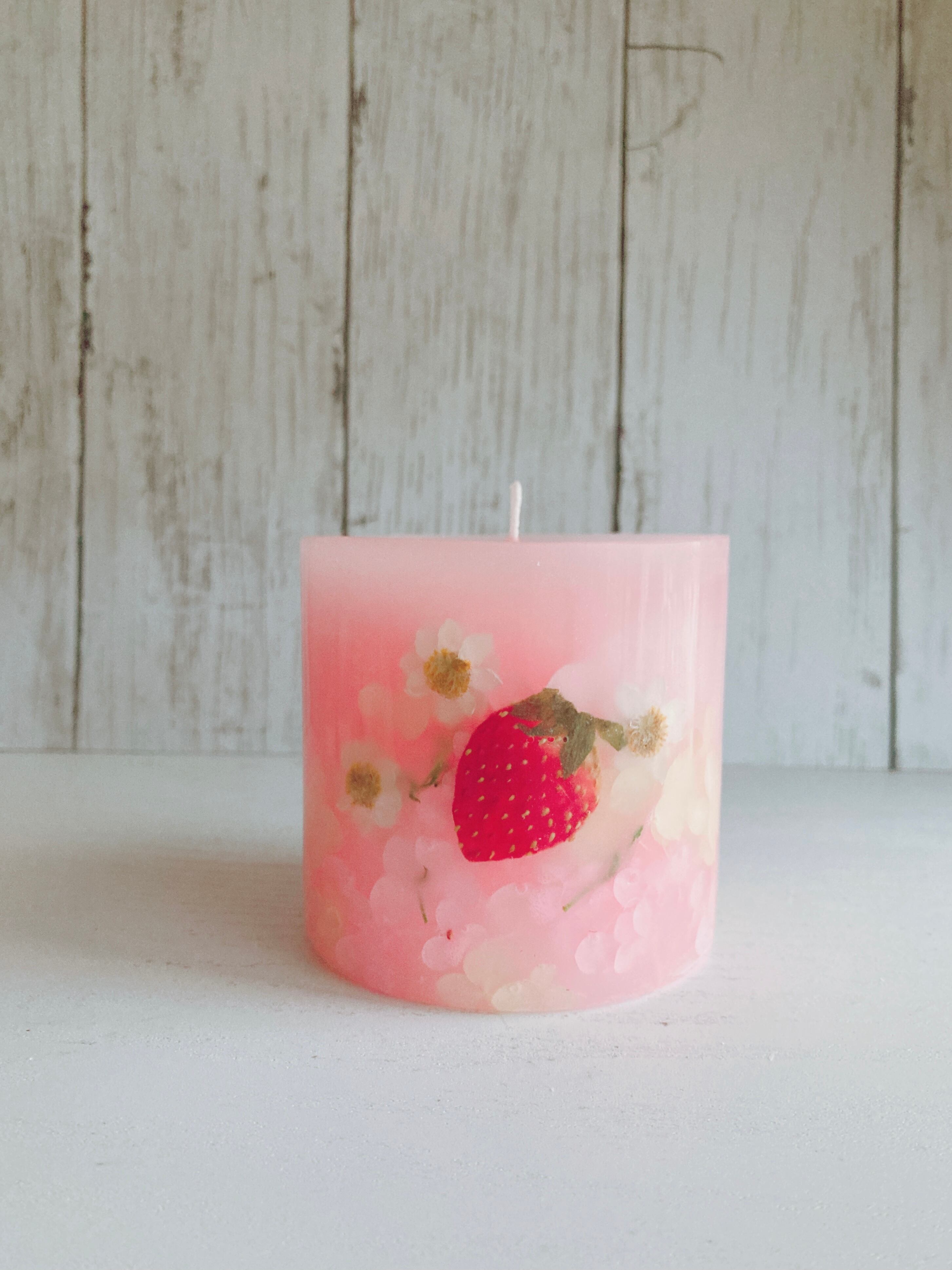 真っ赤ないちごと花かんざしがメインのピンクで可愛らしいキャンドルです。