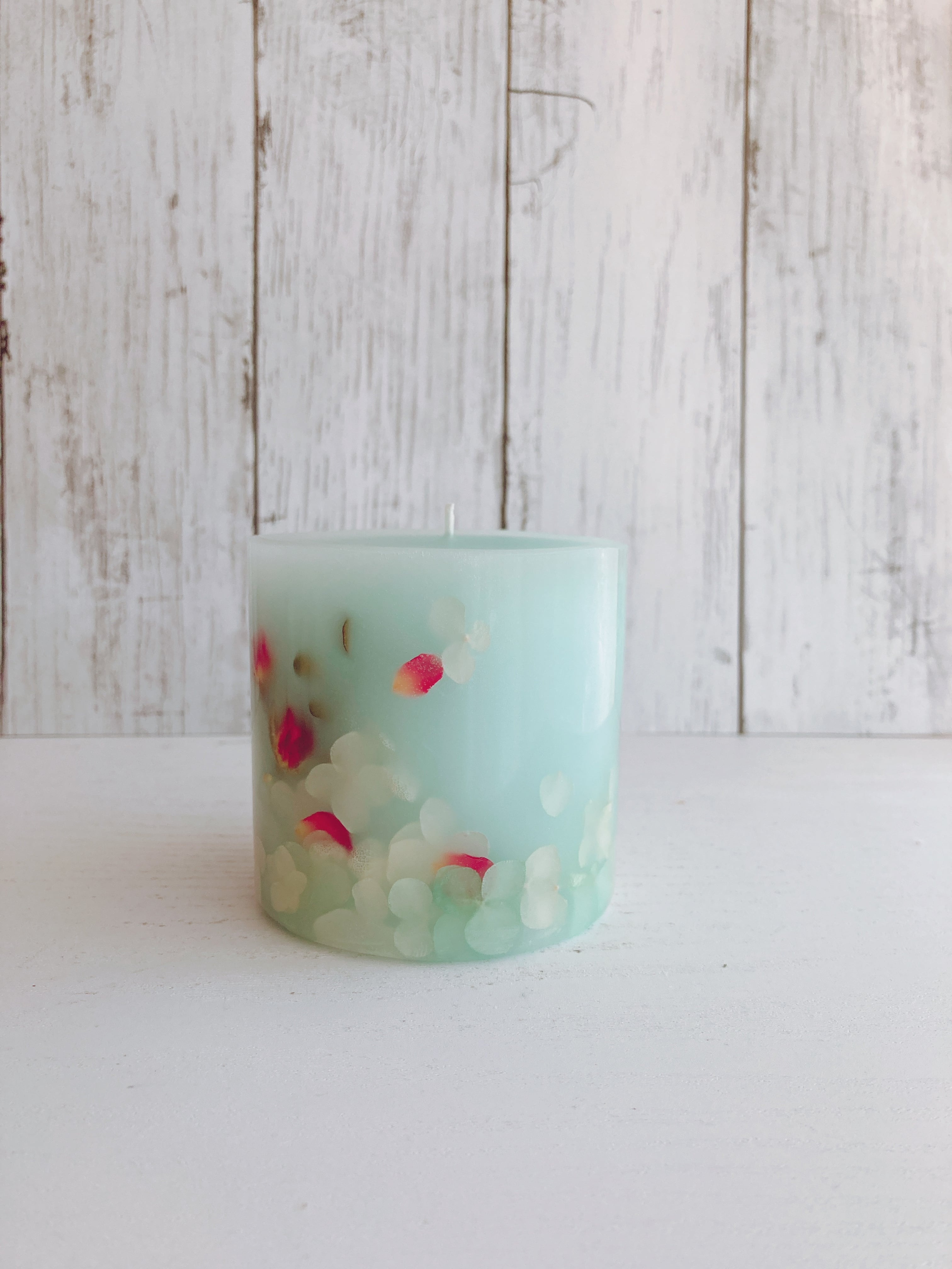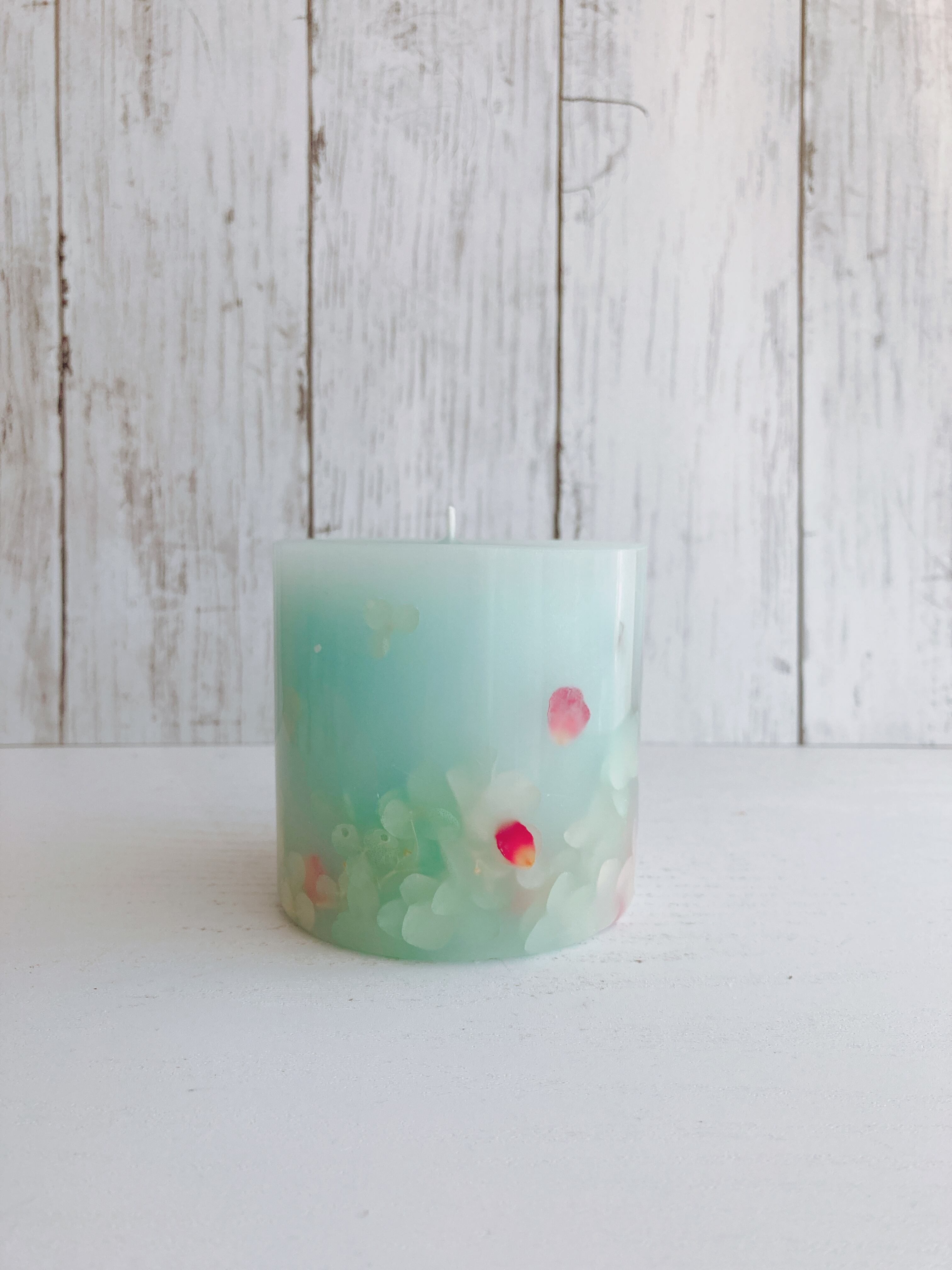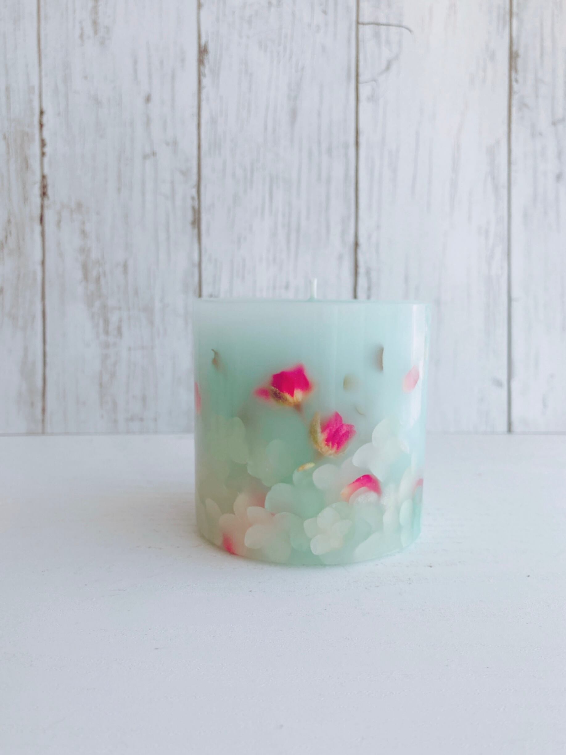 水色ベースのキャンドルに、真っ赤なミニ薔薇と淡い紫陽花をあしらったボタニカルキャンドルです。
