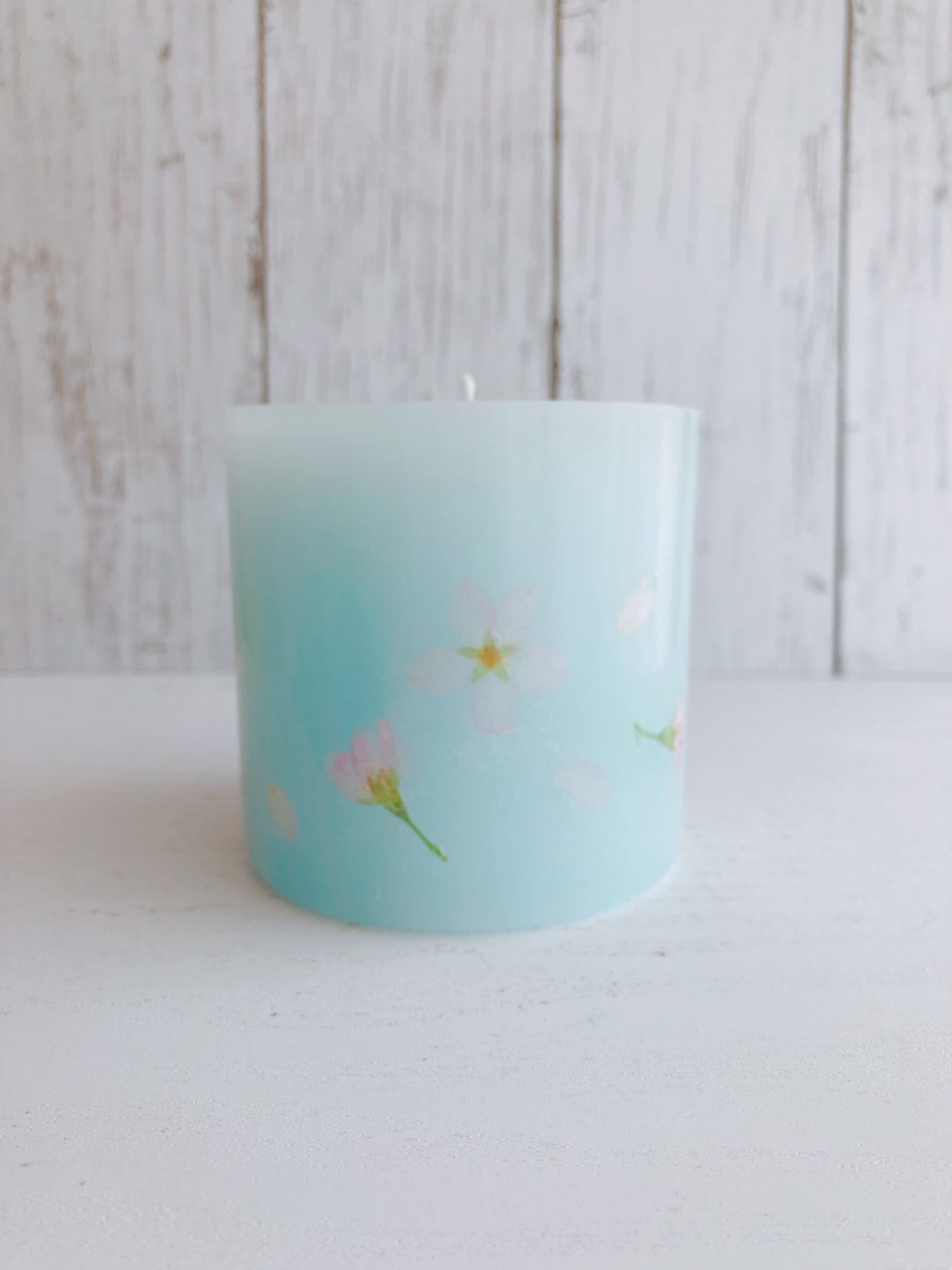 ブルーベースのキャンドルに桜を散りばめた、春らしいキャンドルです。