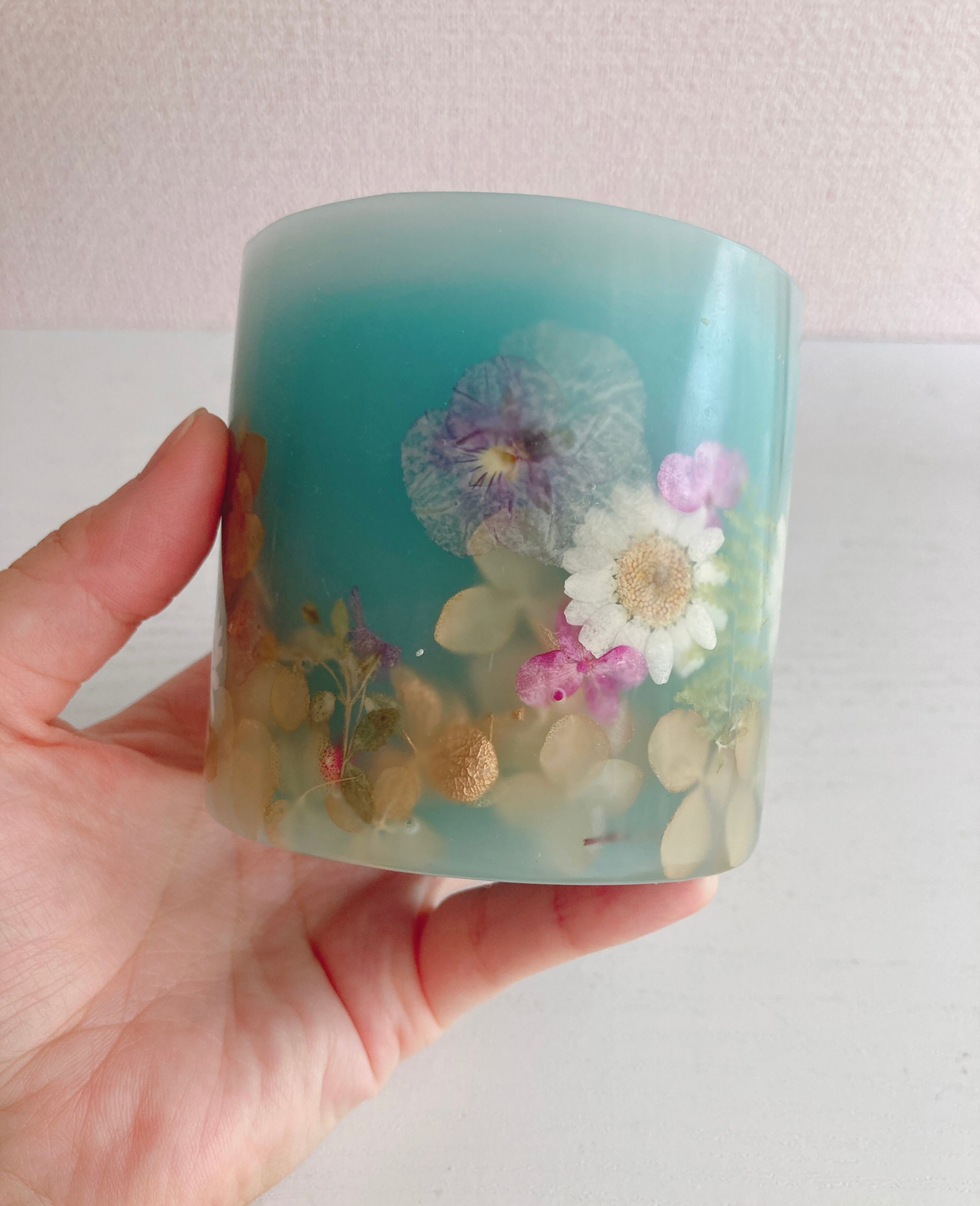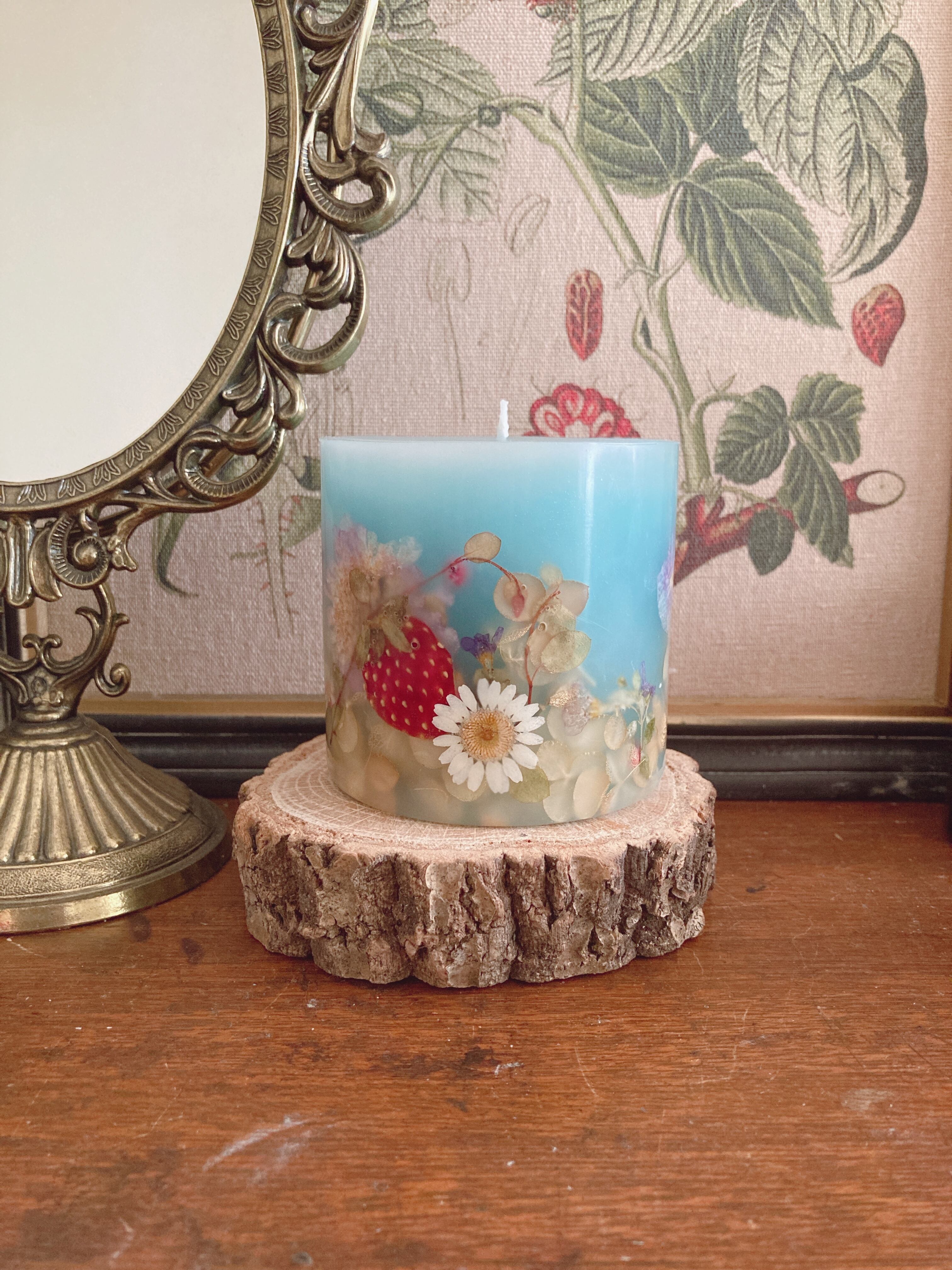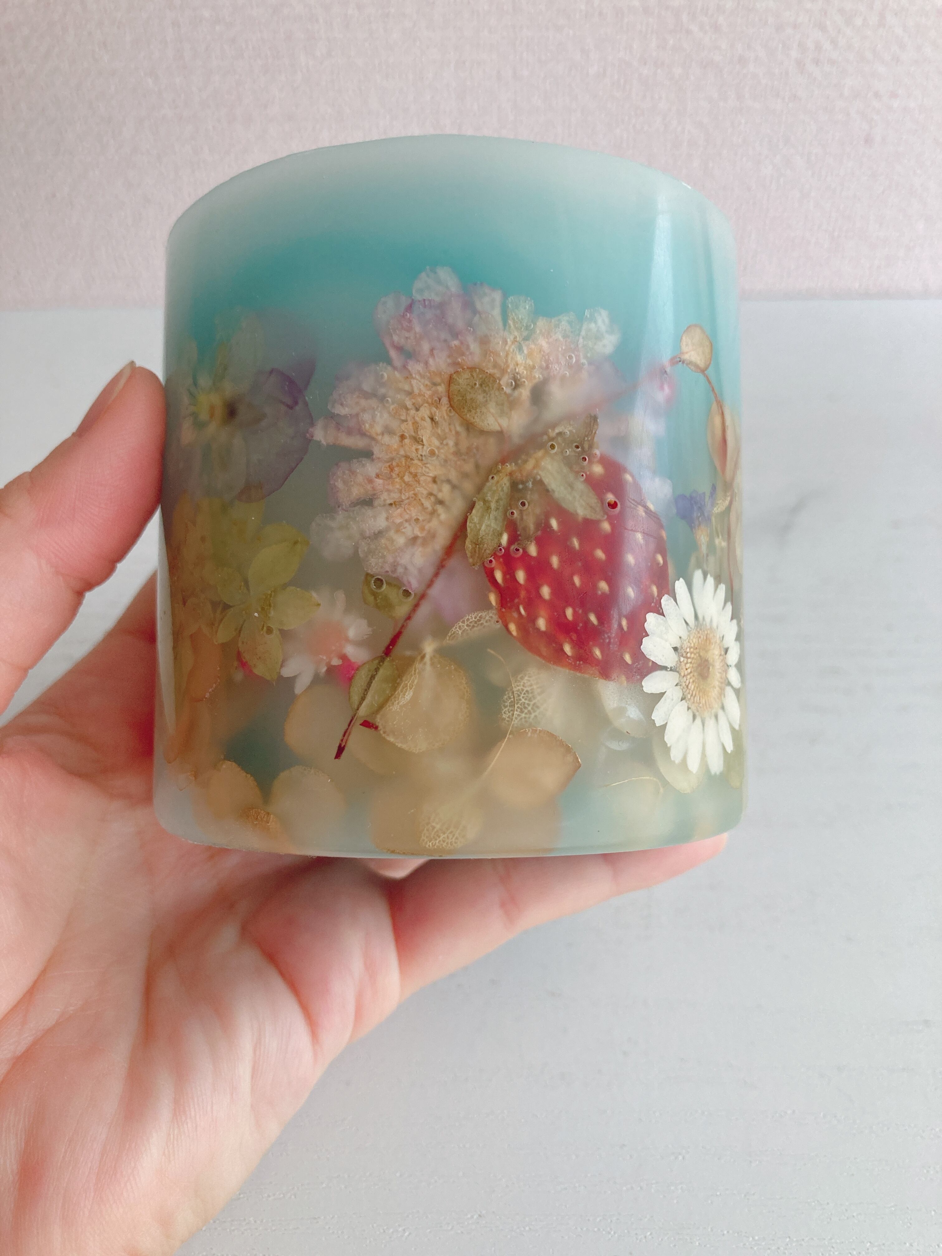 苺とノースポールを中心にビオラや紫陽花など色々なお花が詰まったボタニカルキャンドルです。