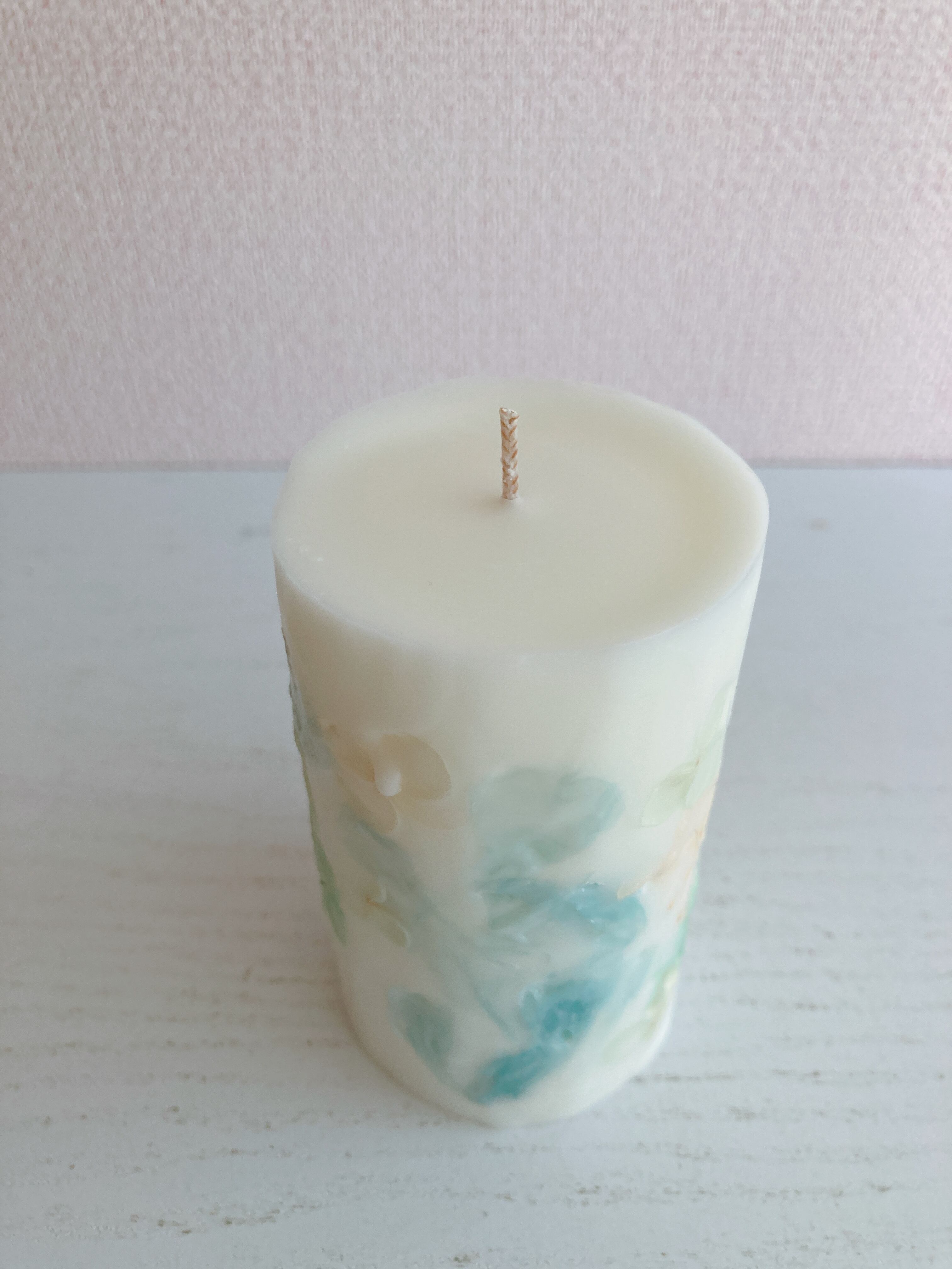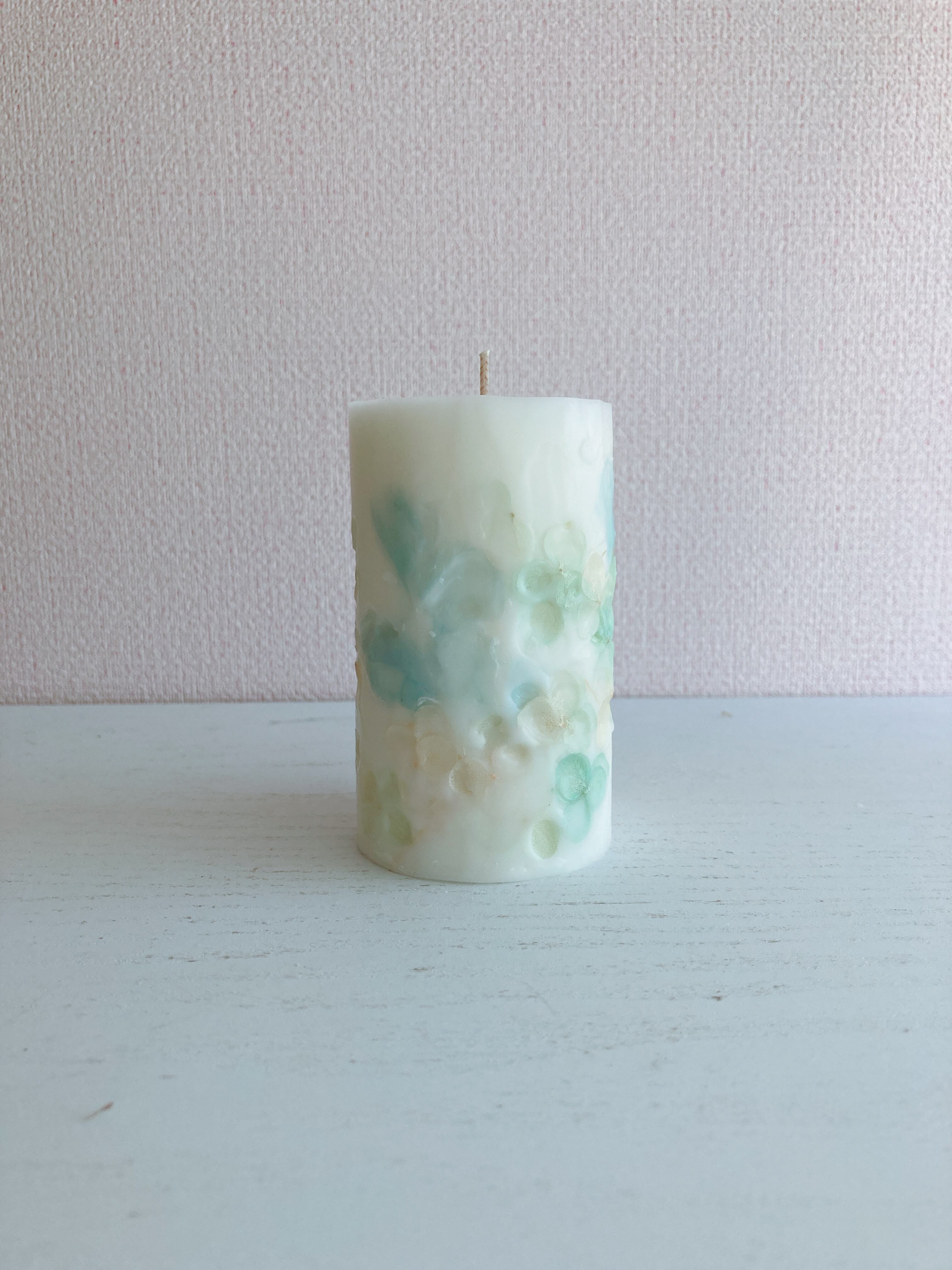 水色のカーネーションと緑の紫陽花のプリザーブドフラワーを詰め込んだ、爽やかな色合いのキャンドルです。