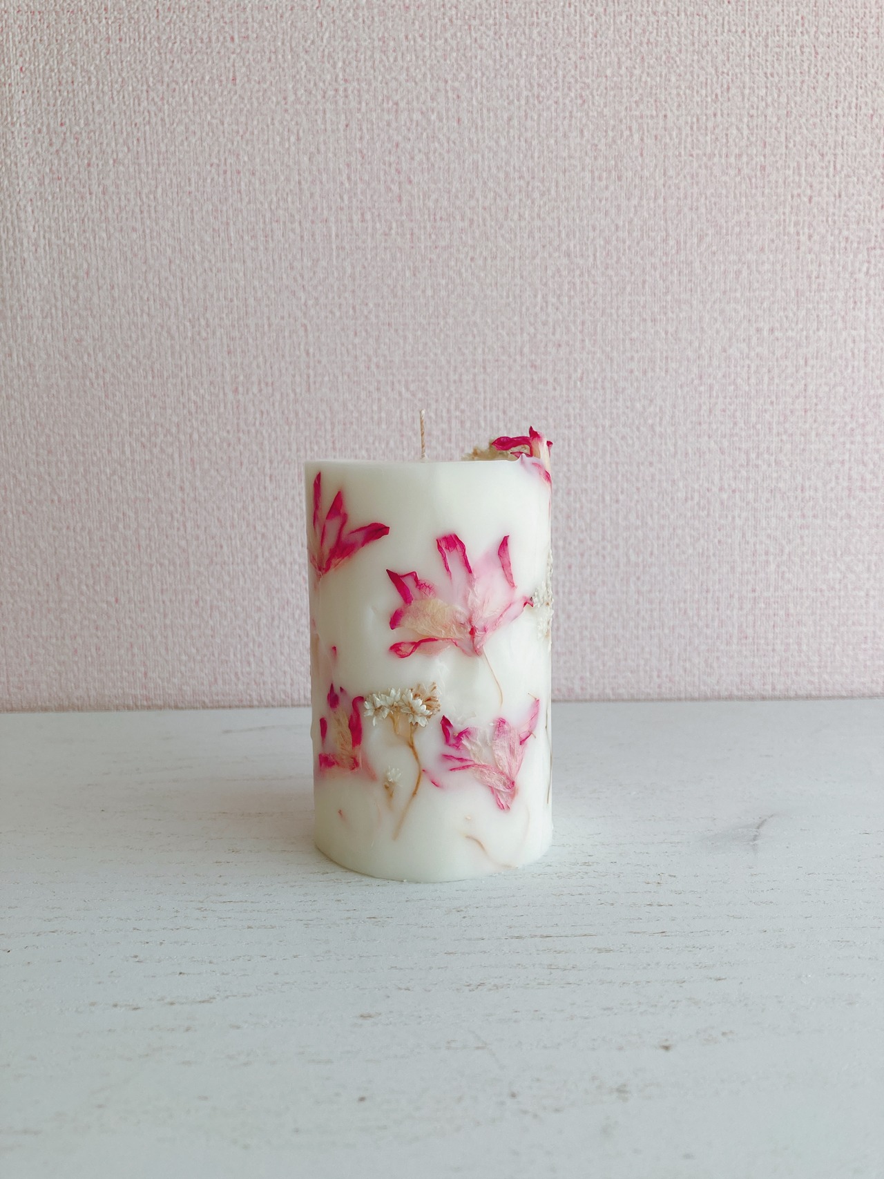 赤いデンドロビウムのドライフラワーがメインのソイボタニカルキャンドルです。