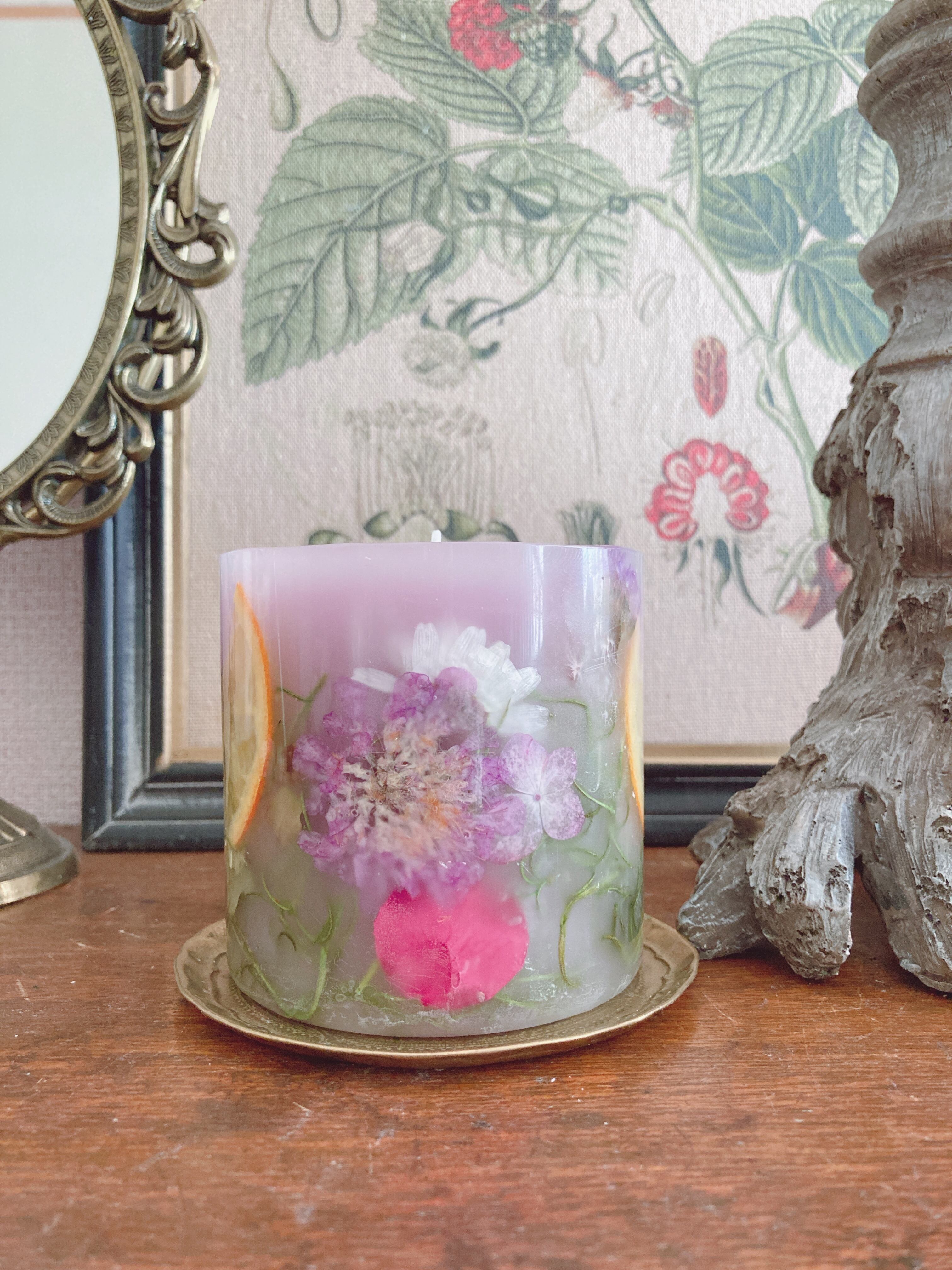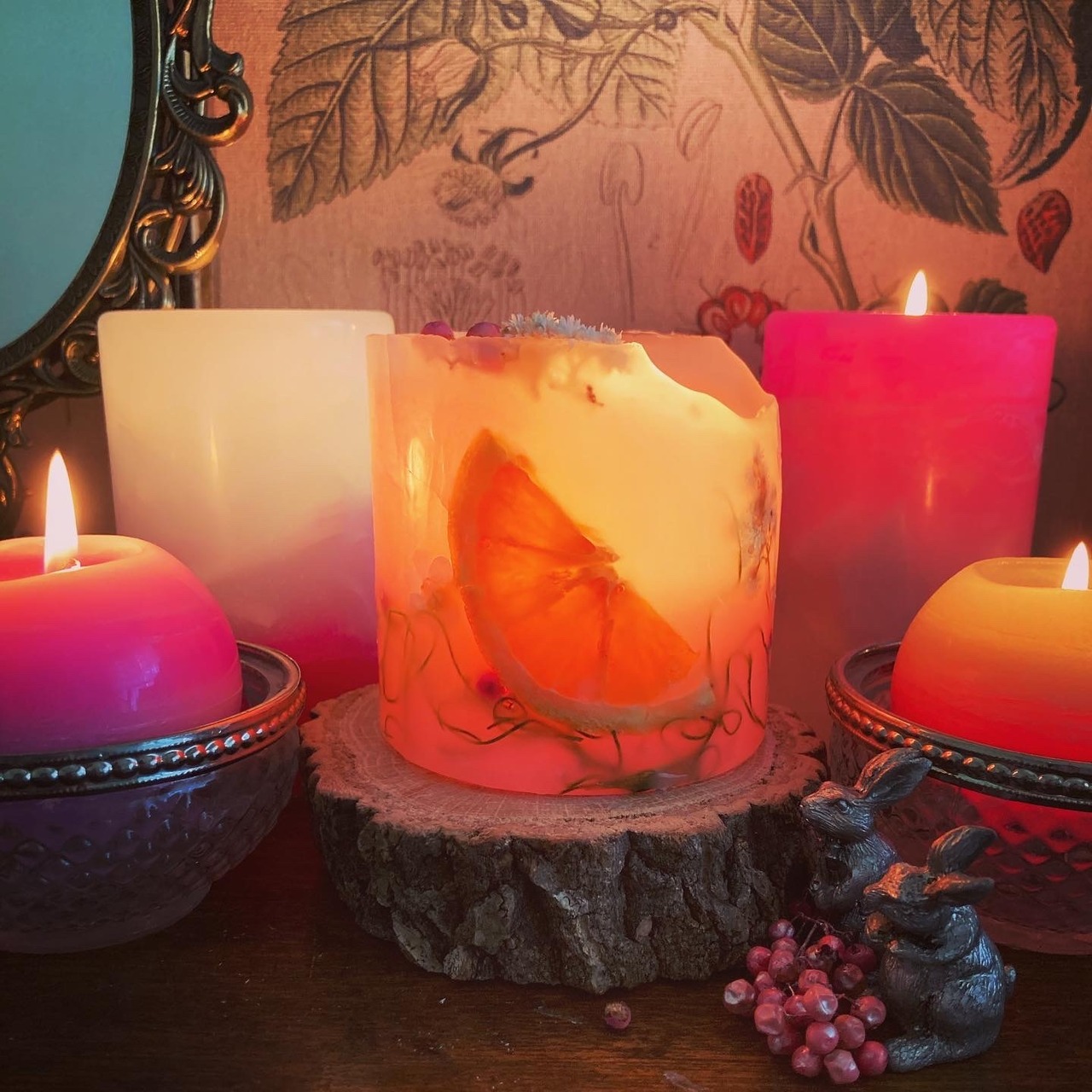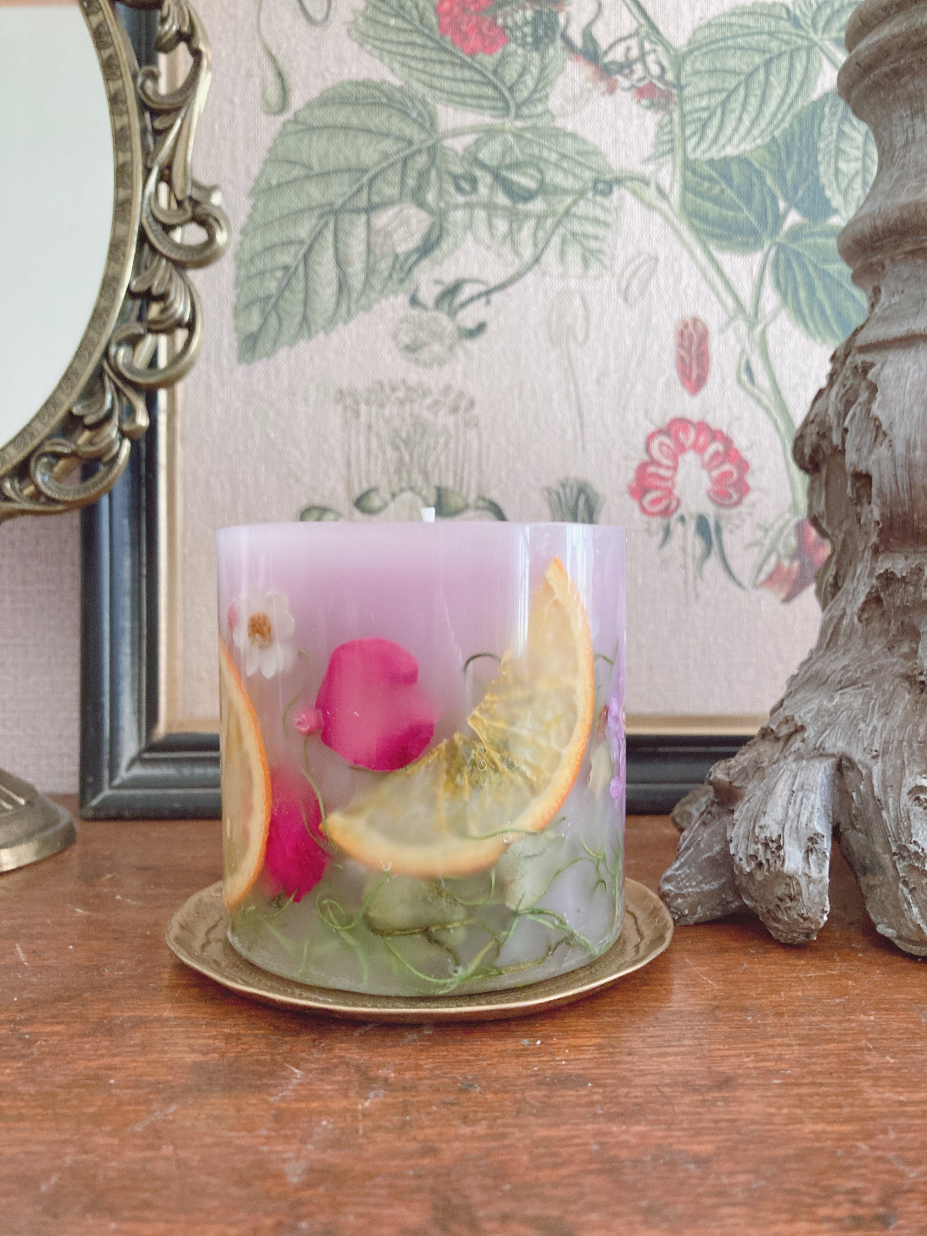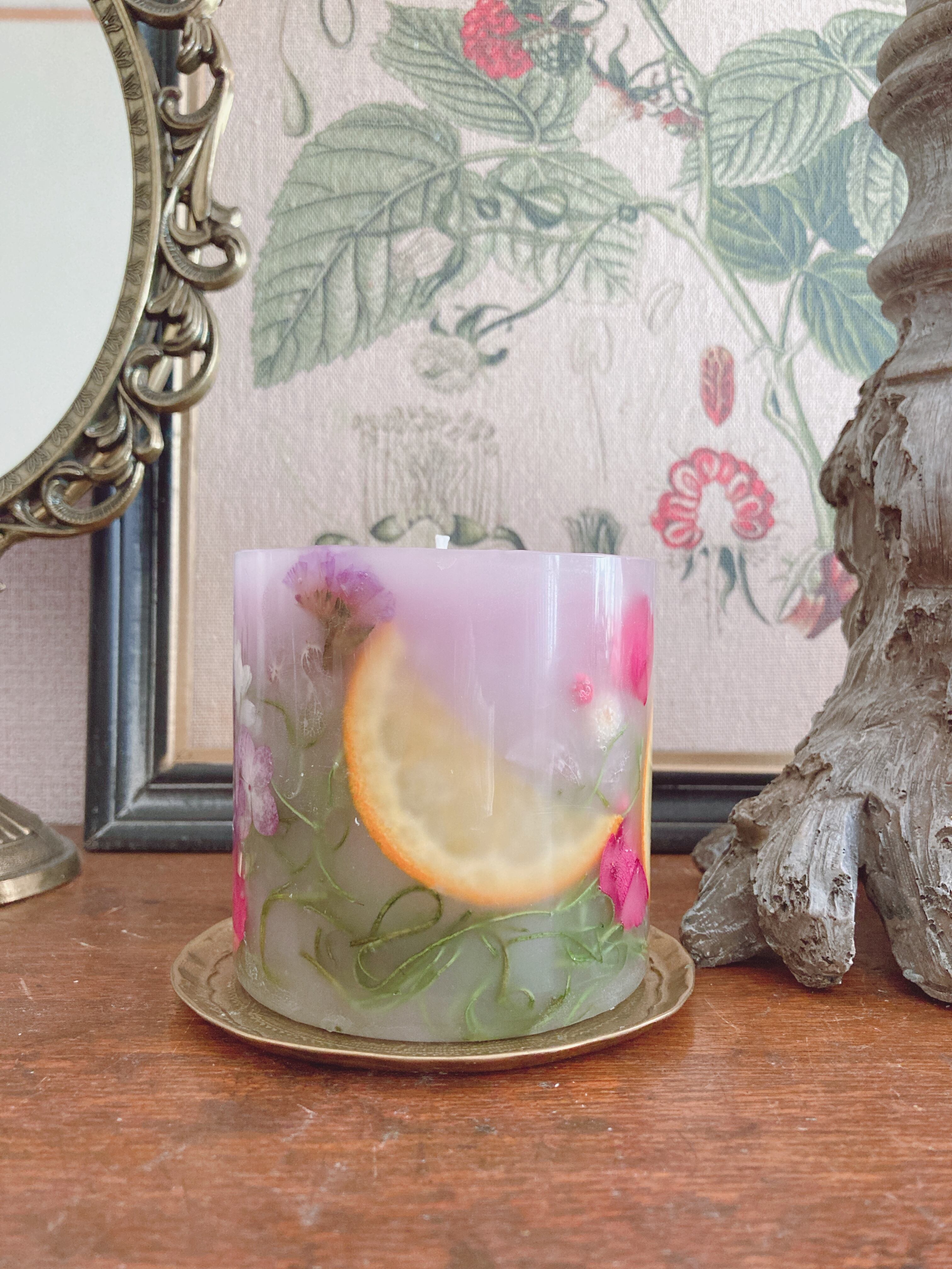 押しフルーツ(オレンジ)を月に見立てた月のリズムキャンドル。こちらはベースが紫のキャンドルとなります。