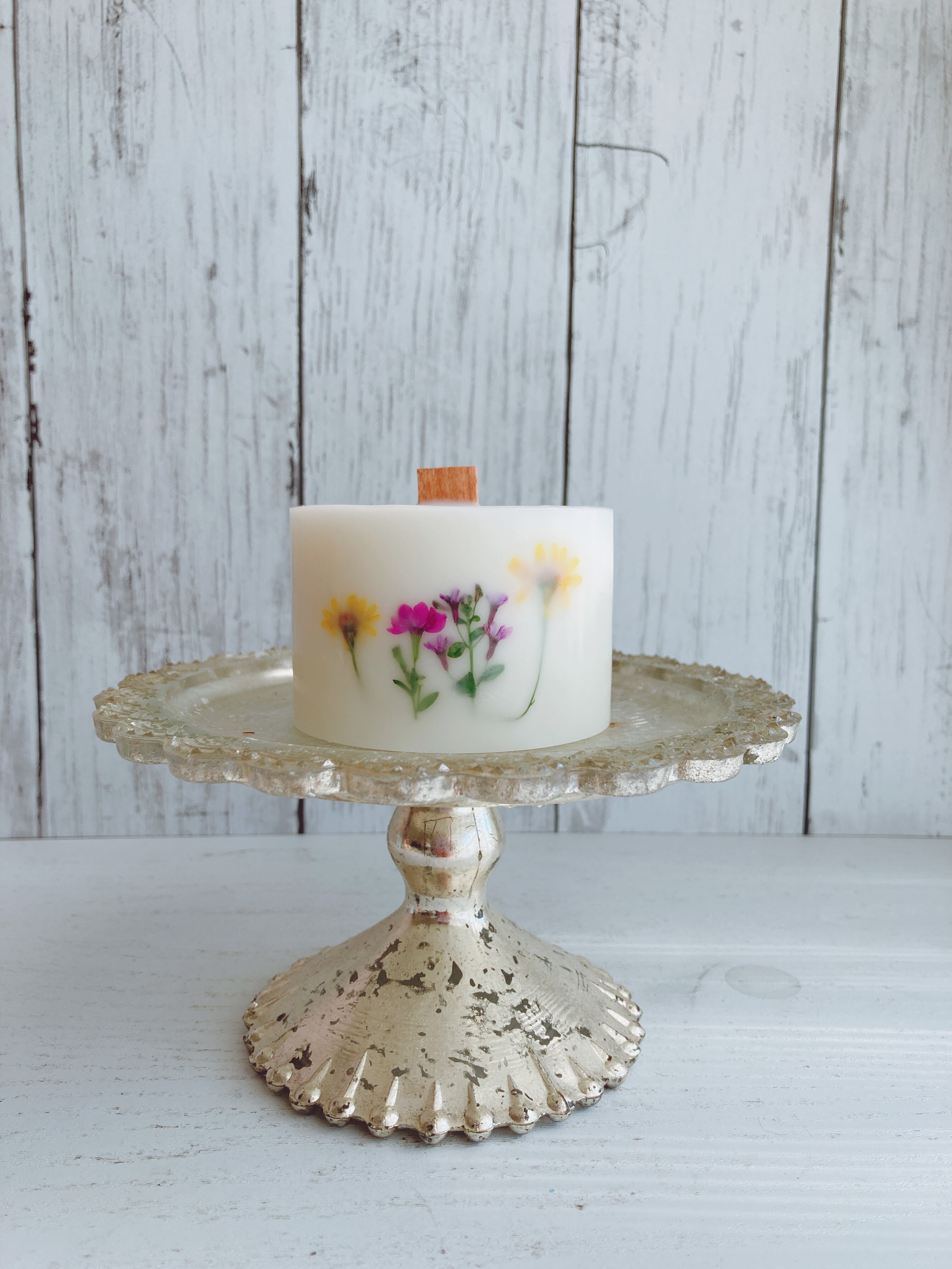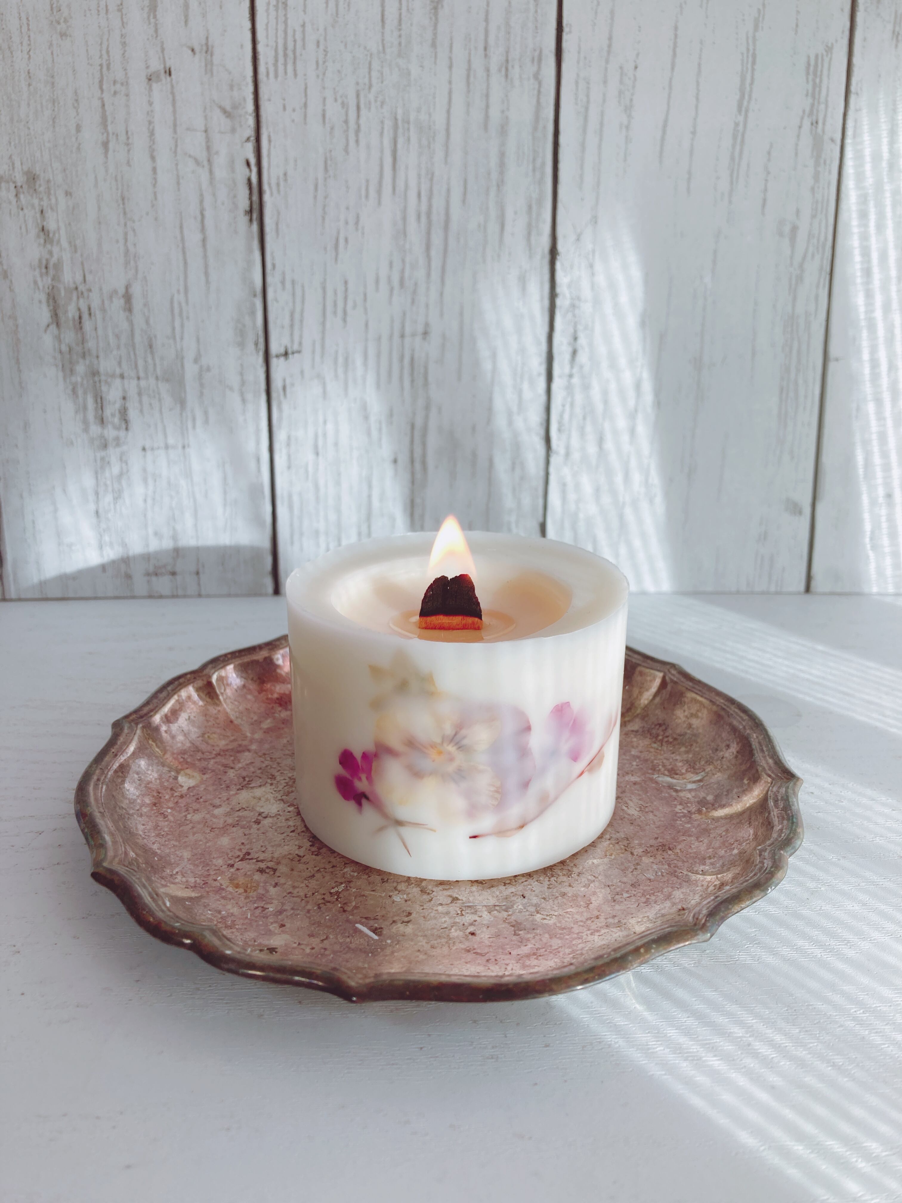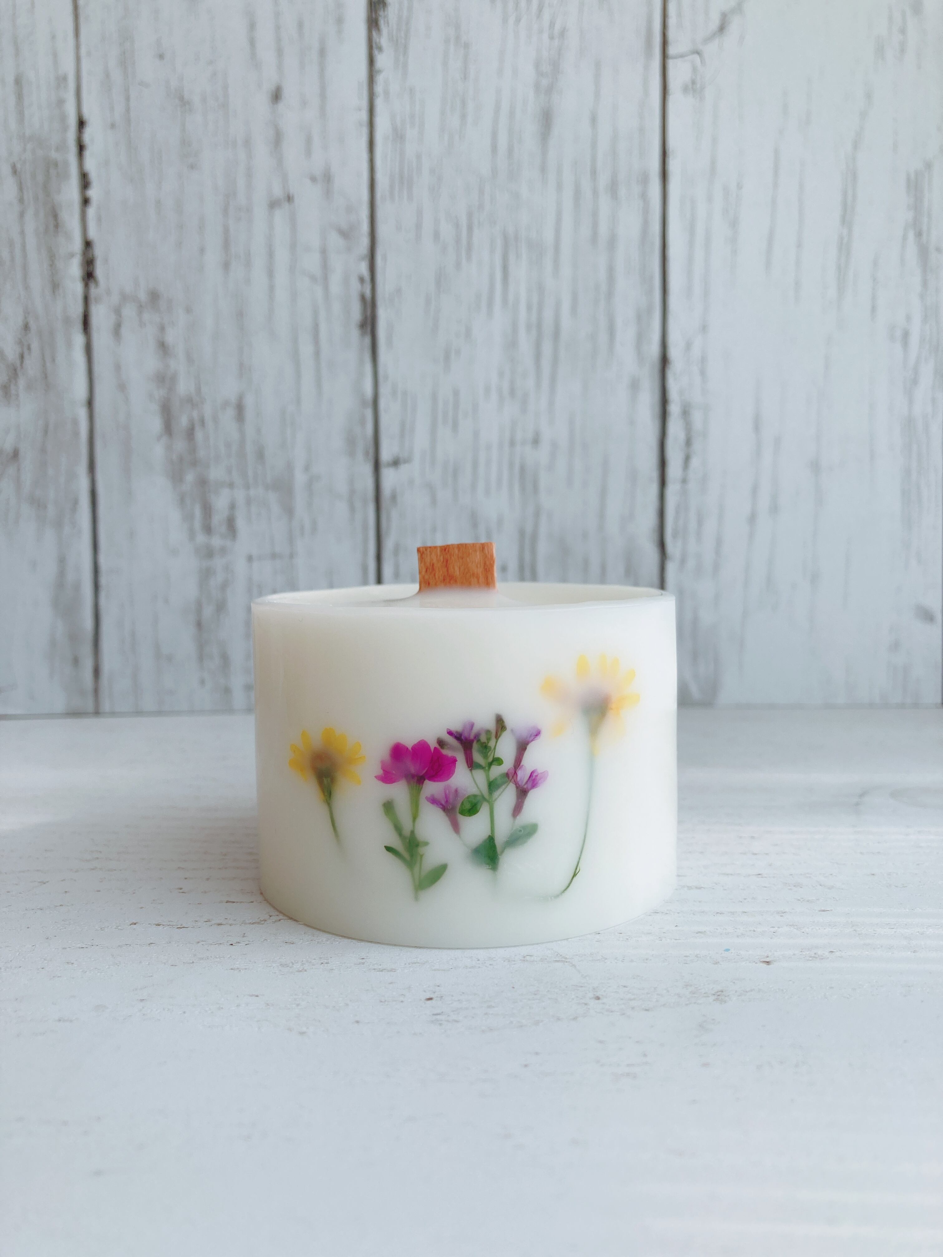 そんな植物由来の体に優しいソイワックスに、押し花をあしらいました。