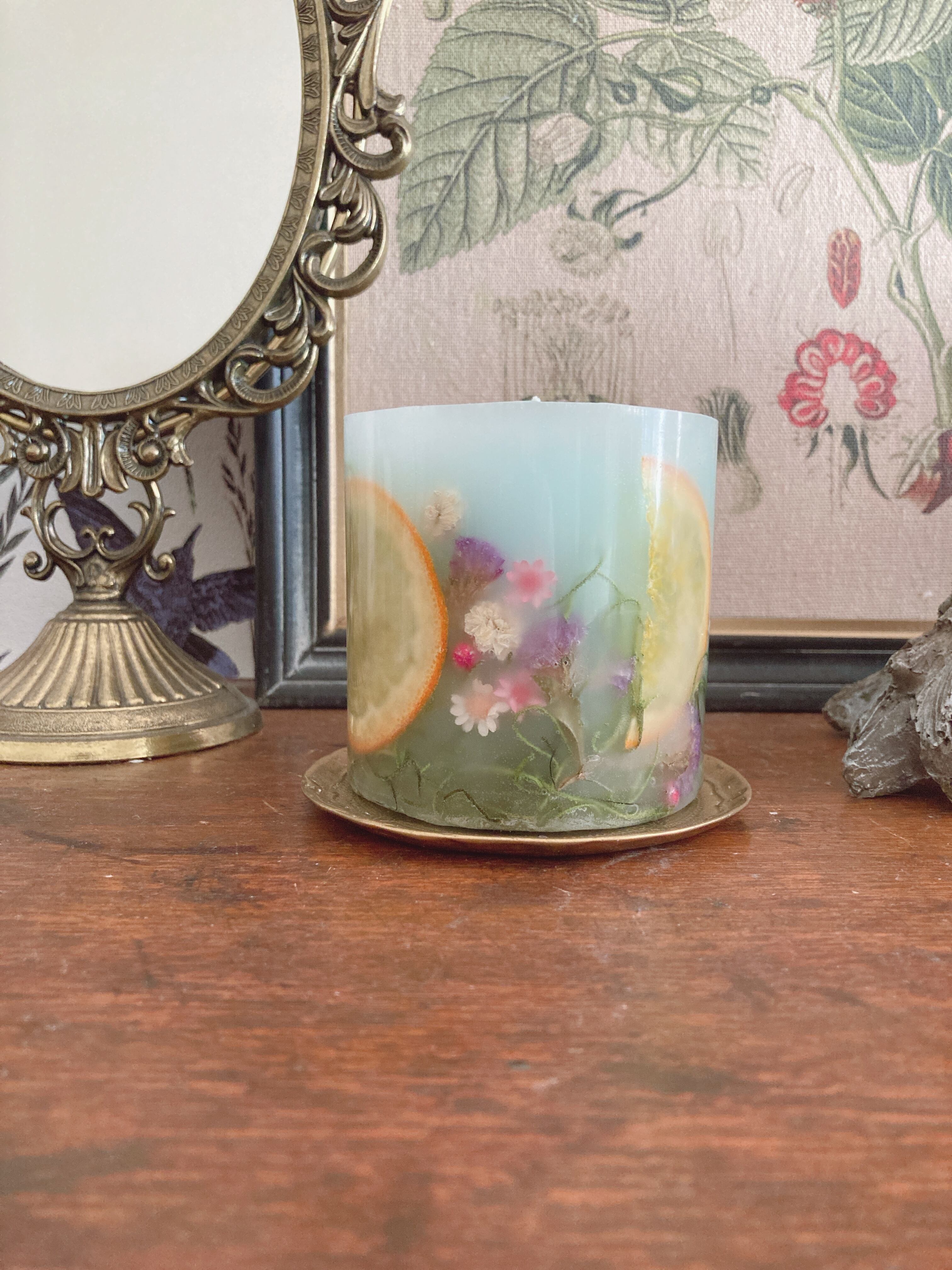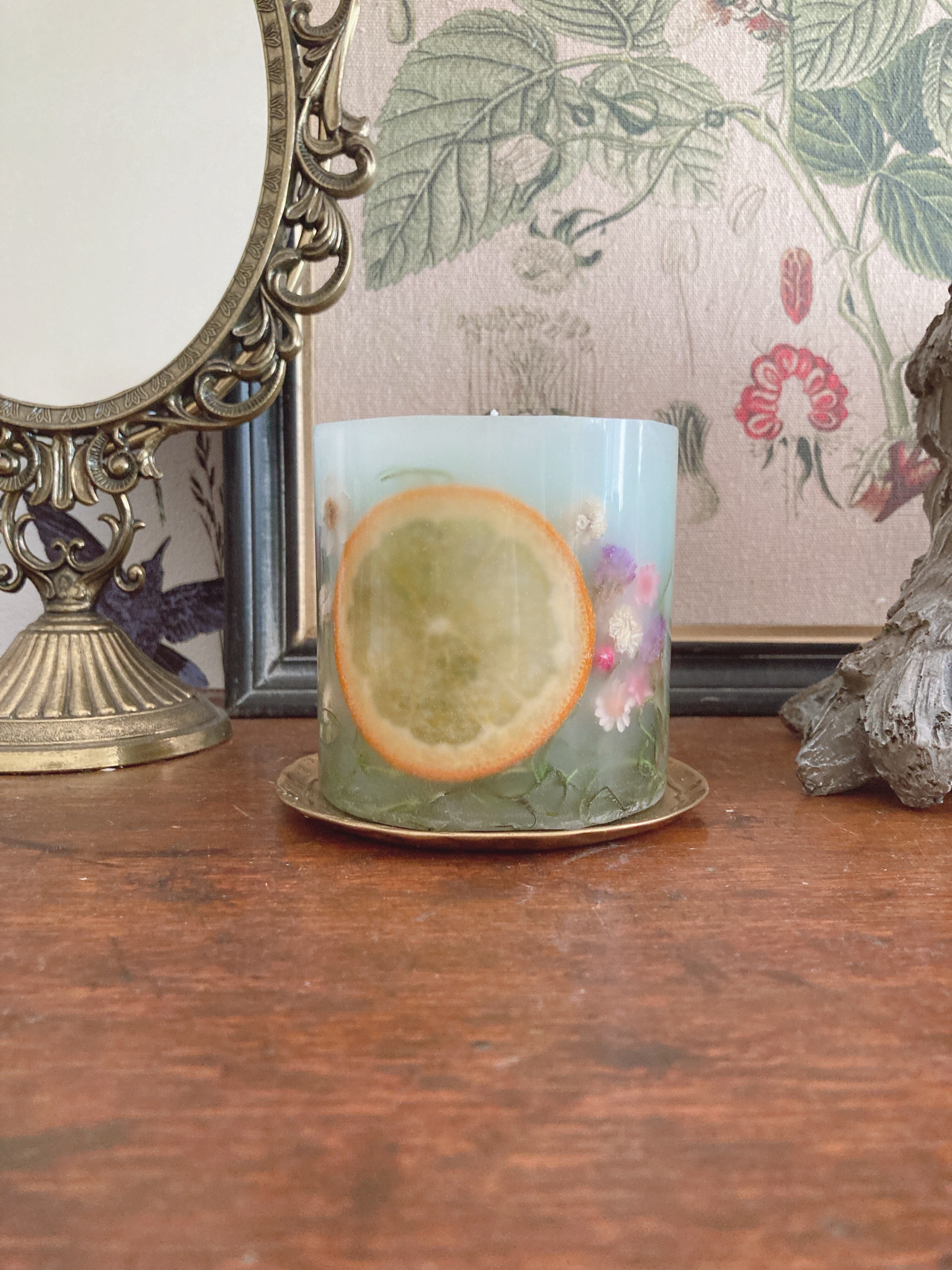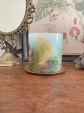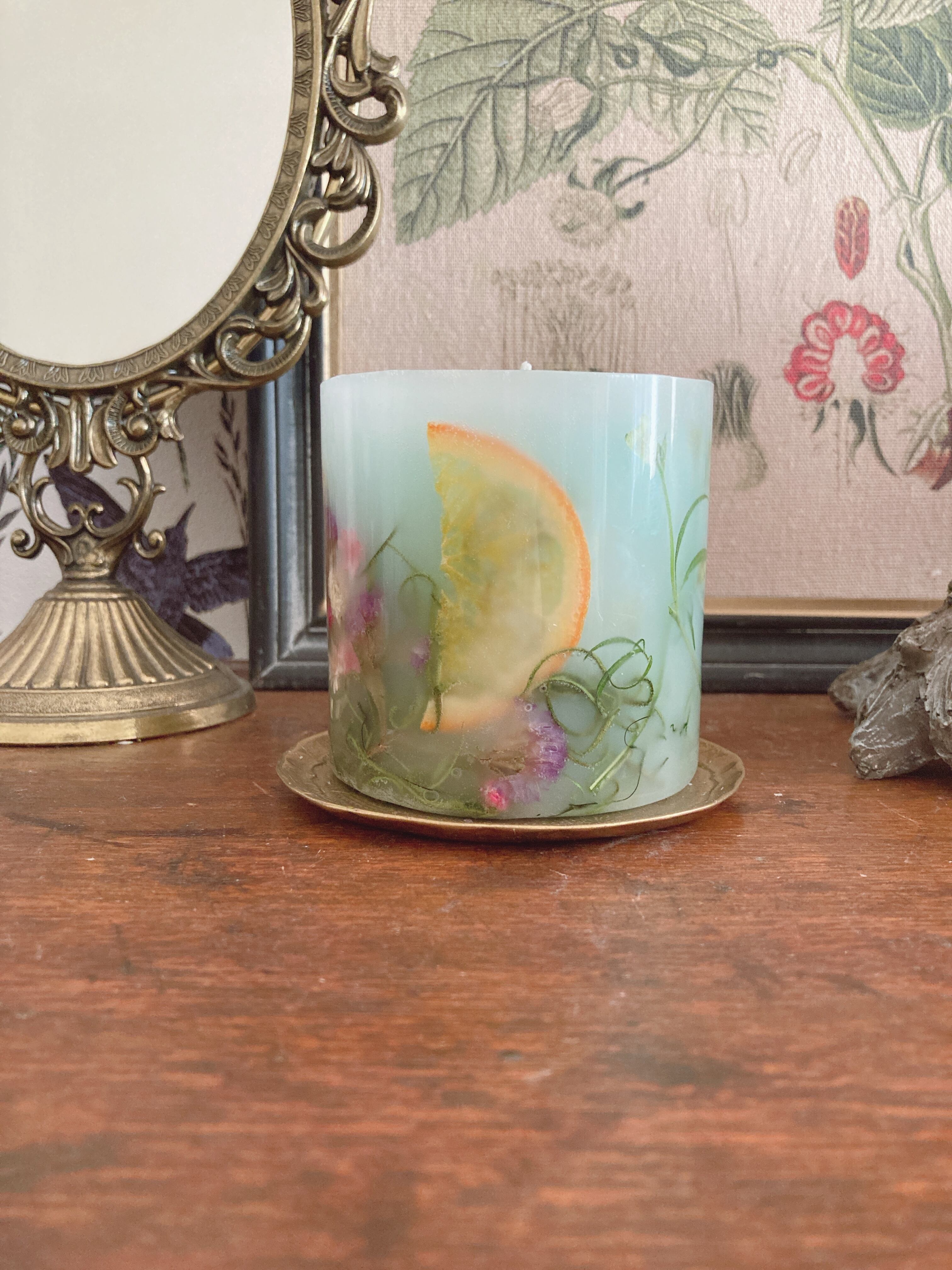 押しフルーツ(オレンジ)を月に見立てた月のリズムキャンドル。こちらはベースが薄緑のキャンドルとなります。