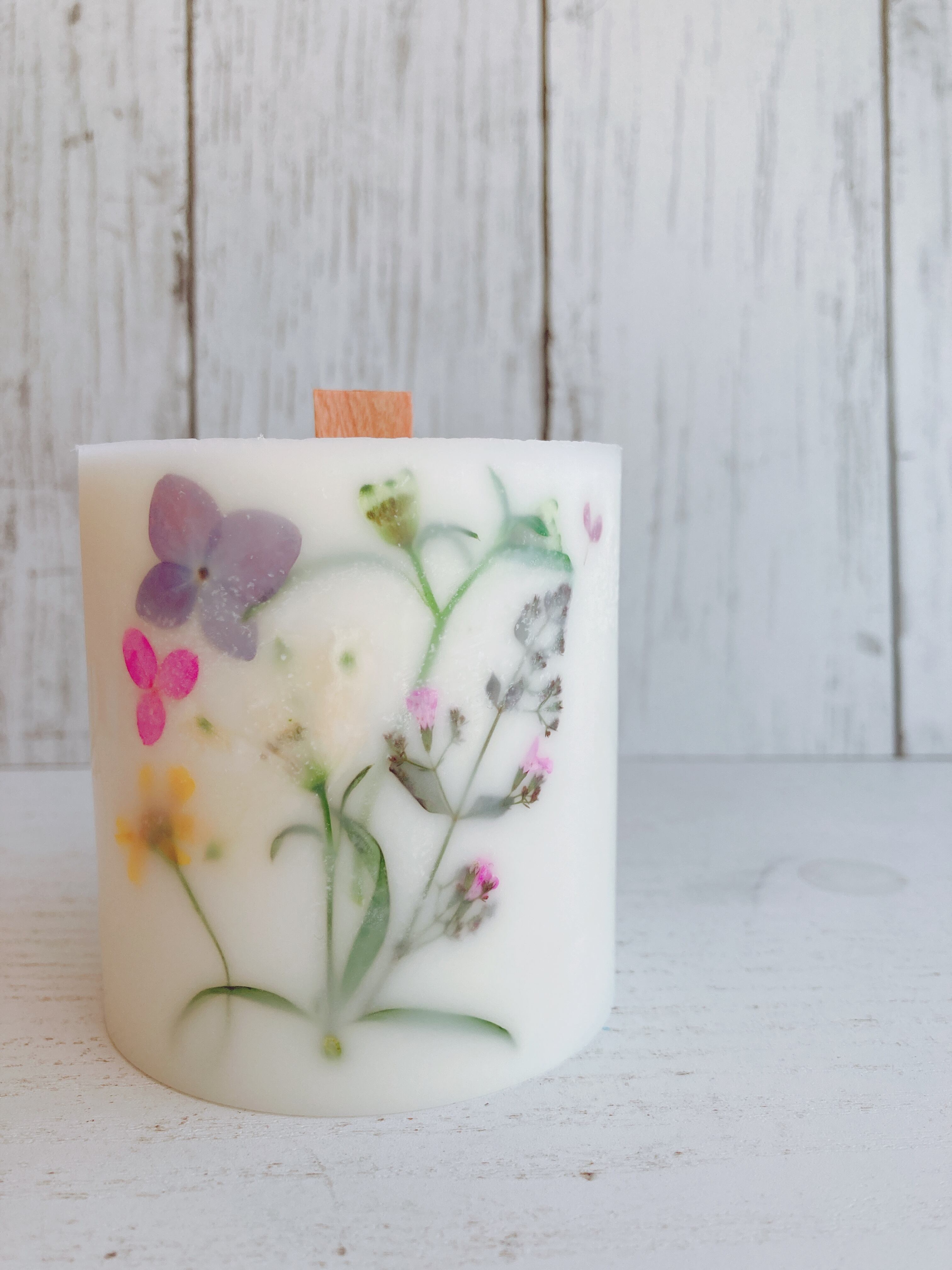 そんな植物由来の体に優しいソイワックスに、押し花をあしらいました。