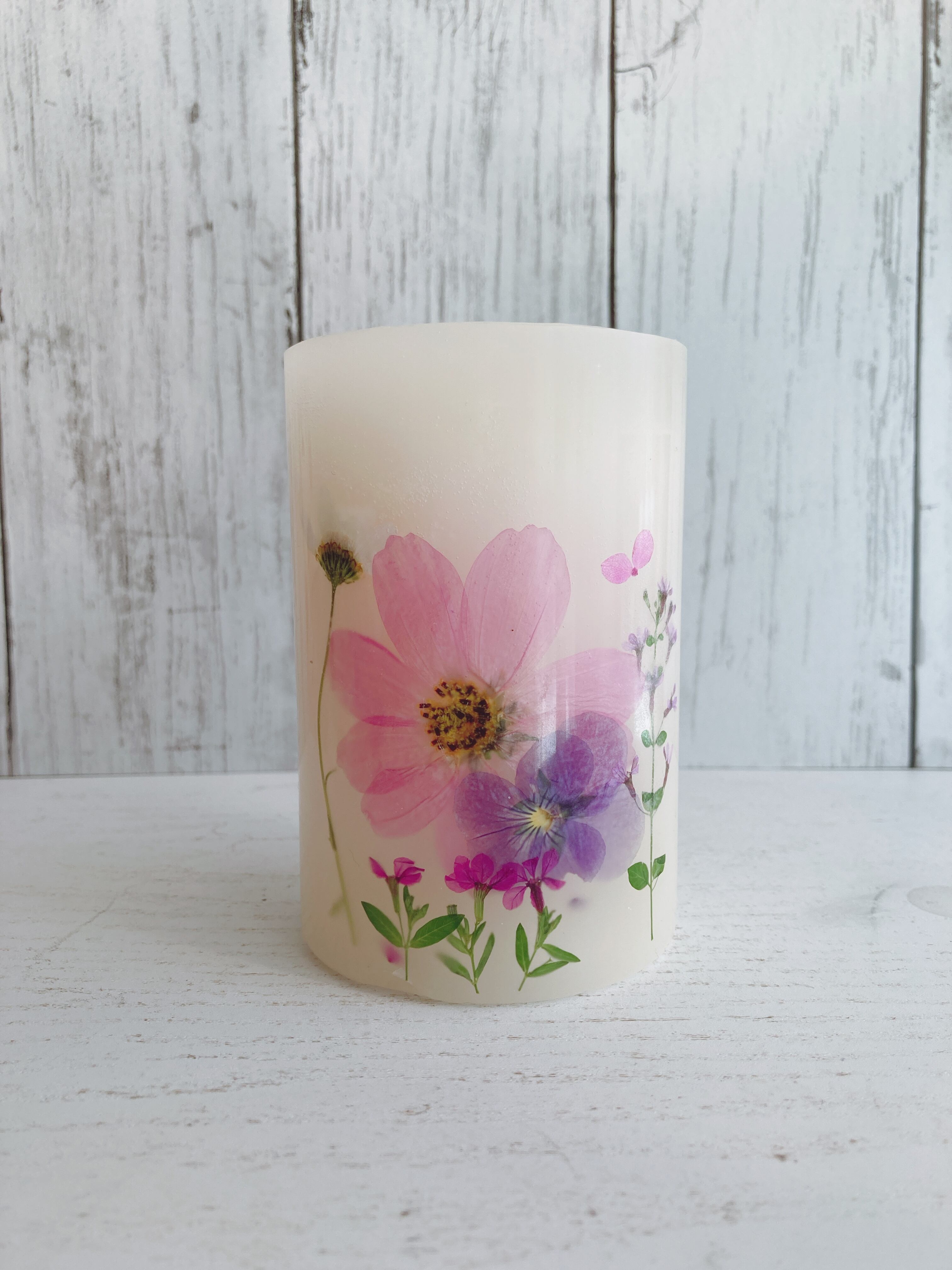 淡いクリーム色のキャンドルに可愛い押し花をあしらいました。