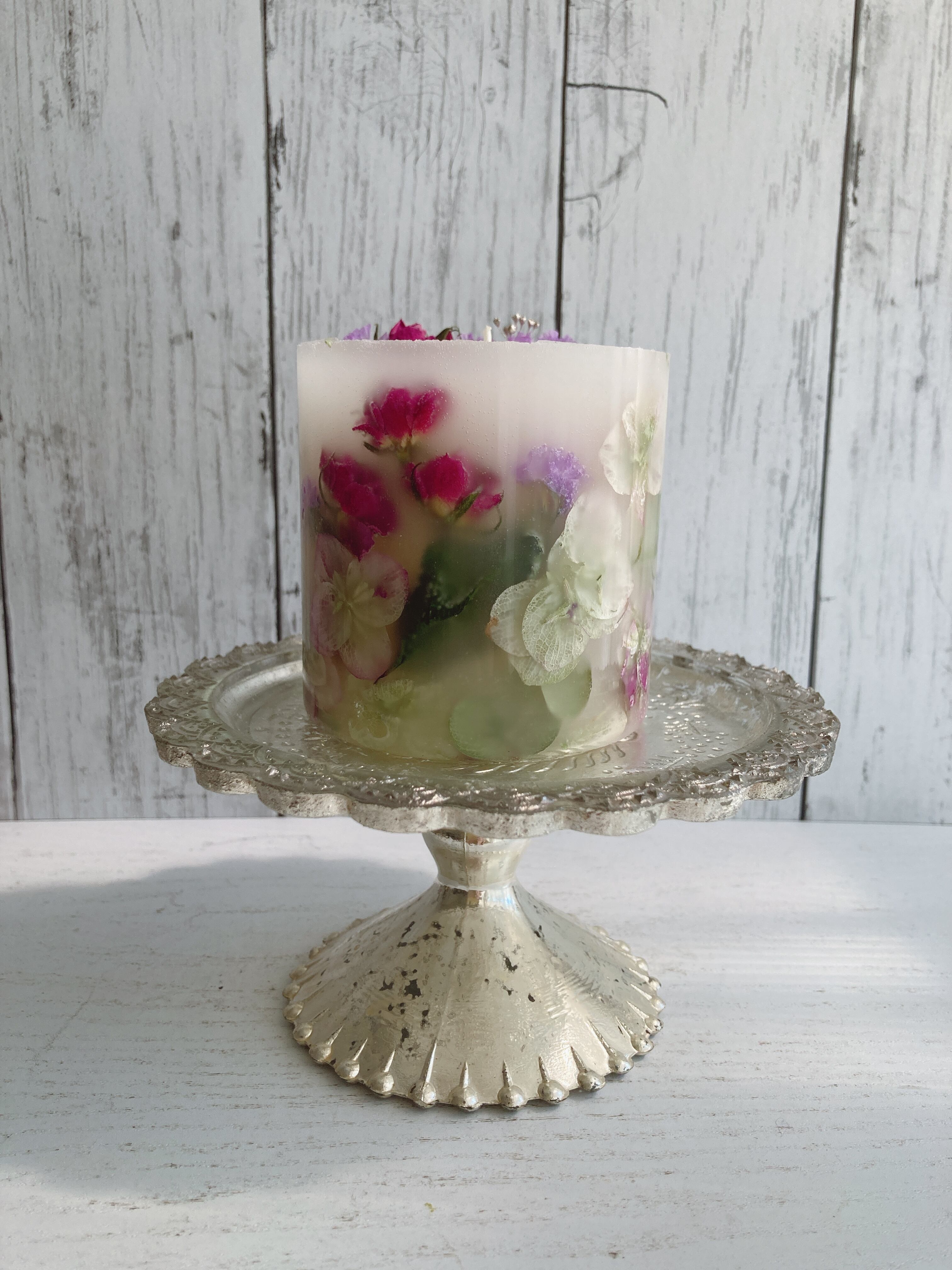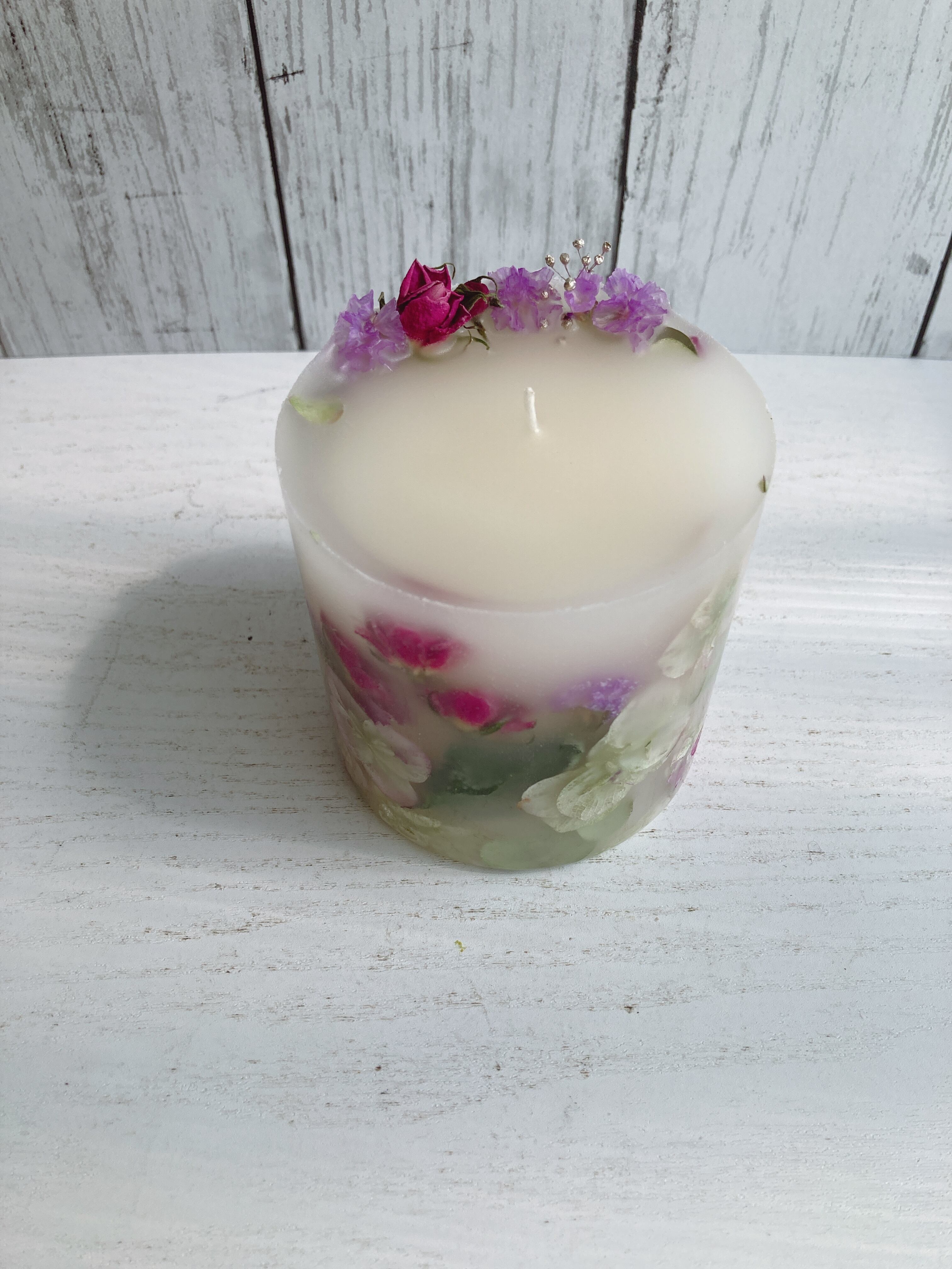 薔薇とオレガノのドライフラワーがメインの落ち着いた色合いのボタニカルキャンドルです。